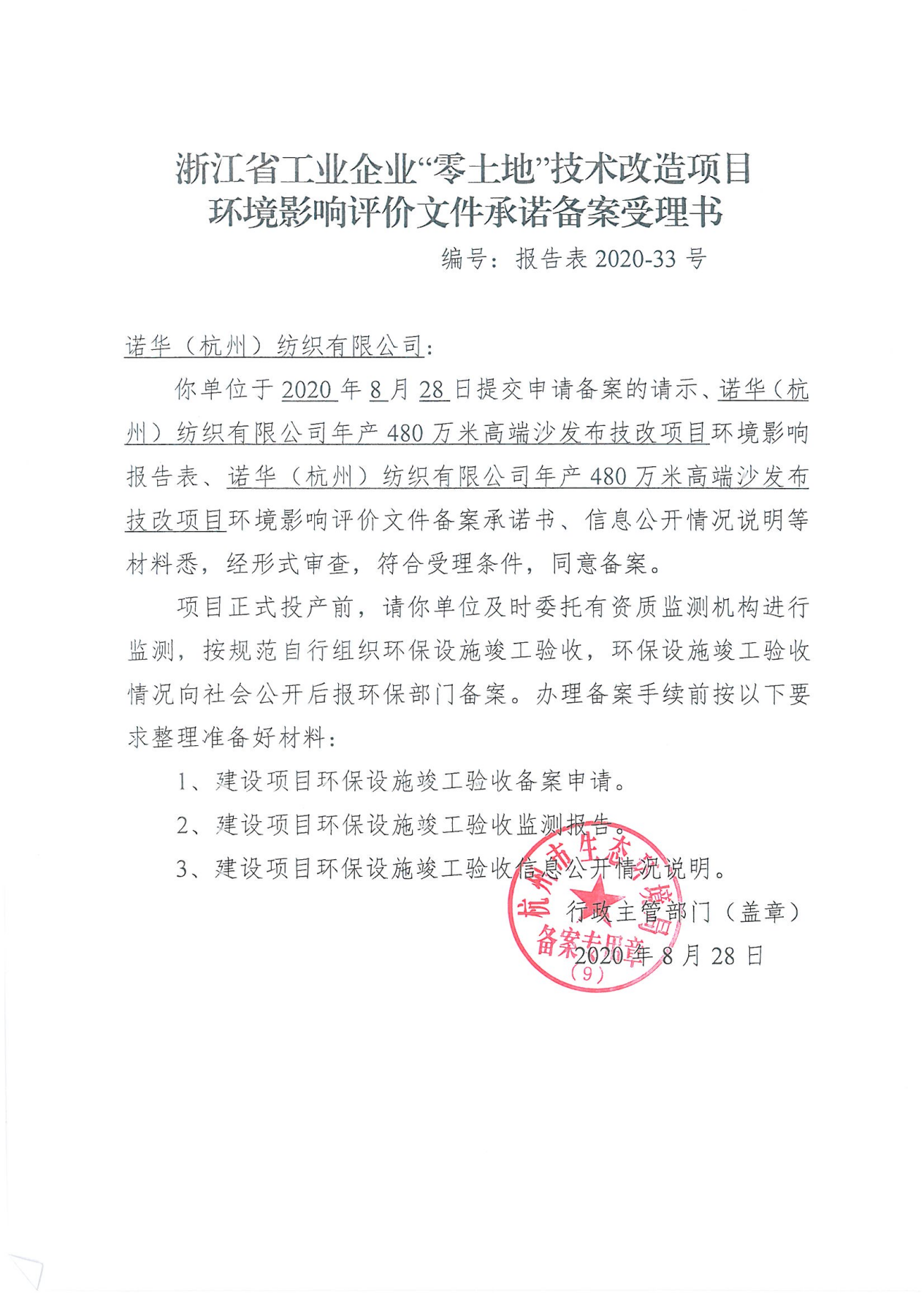 諾華(杭州)紡織有限公司年產(chǎn)480萬米高端沙發(fā)布技改項(xiàng)目 |