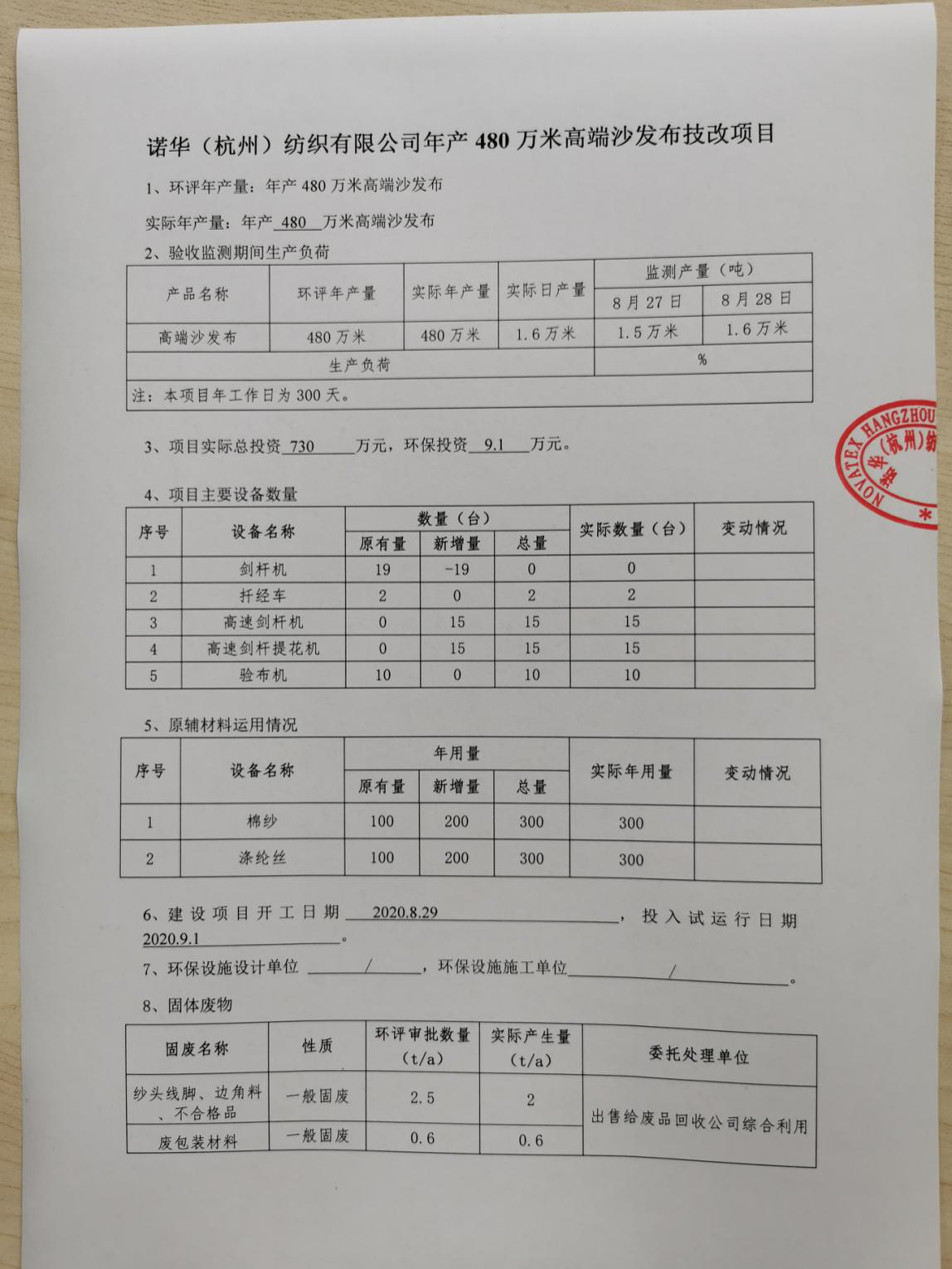 諾華(杭州)紡織有限公司年產(chǎn)480萬米高端沙發(fā)布技改項(xiàng)目竣工環(huán)境保護(hù)驗(yàn)收監(jiān)測報(bào)告表
